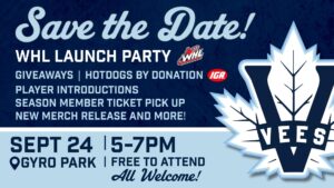 The Penticton Vees are excited to announce their WHL Launch Party celebrating their inaugural WHL season, which will take place Wednesday Sept. 24 at Gyro Park from 5 p.m. to 7 p.m. This will be an historic event that will live forever as we enter a new era of Vees hockey!