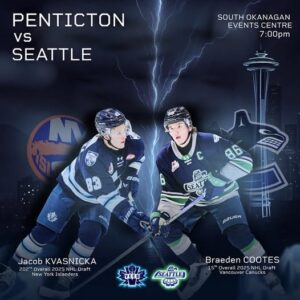 The Penticton Vees back on the ice tonight at the SOEC, looking to get back in the win column after a 6-2 defeat on Wednesday, at the hands of the Kelowna Rockets. Rockets scored quick and held a 2-0 lead after 1. Goals by Tristan Petersen and Louis Wehmann evened things up for Penticton thru 2, but a 4 goal third pushed Kelowna to the victory.