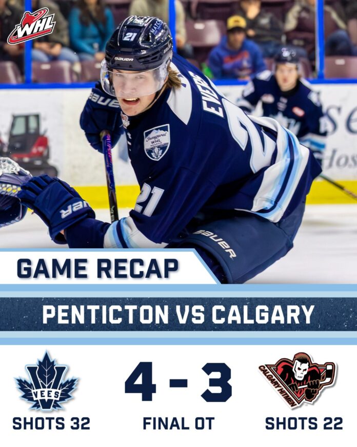 -It was an amazing atmosphere Saturday night at the SOEC, as over 4300 were in attendance to see Penticton win their 11th in a row, in dramatic fashion with the OT win over the Hitmen. Ryden Evers scored the game winner, 3:07 into the extra frame. Diego Johnson, Jacob Kvasnicka and Louie Wehmann also tallied for the Vees. The game was extra fun, as Canadian country star Jojo Mason sang the national anthem, and did a mini concert in the 1st intermission.