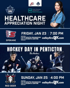 -Tonight, the Vees host Spokane at 7 at the SOEC for ‘Health Appreciation Night’. Interior Health staff will receive exclusive access to discounted game tickets. And thanks to the generosity of local philanthropist John Pankiw, 100 complimentary tickets have been reserved so healthcare workers can attend as honoured guests.